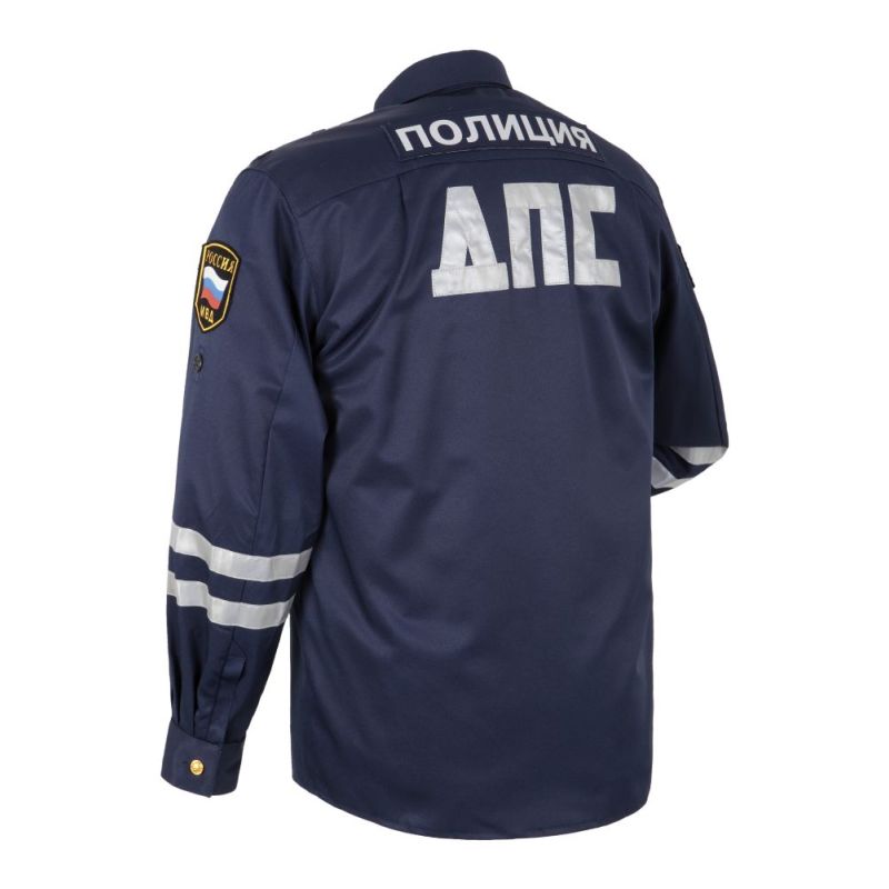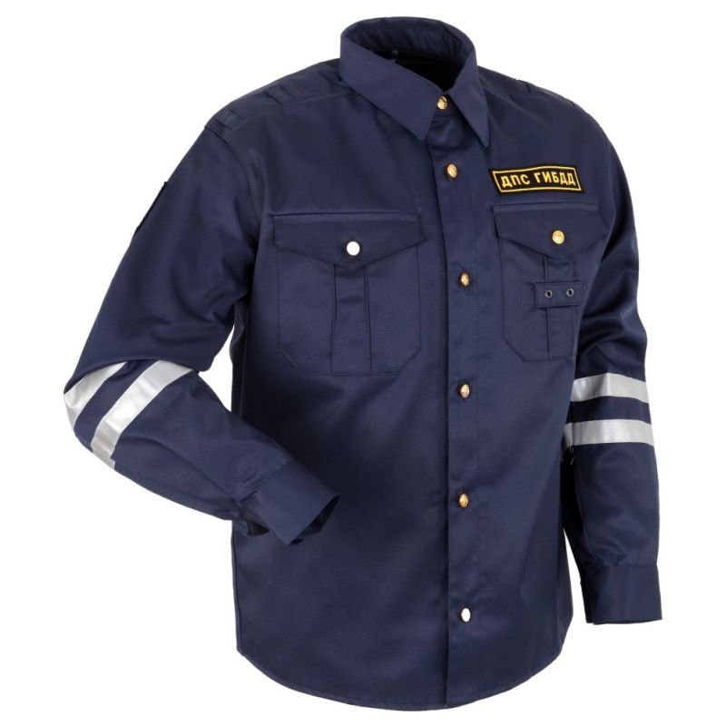 Куртка прямого силуэта без подкладки с центральной застежкой на пуговицы. Карманы нагрудные на пуговицах, на левом кармане пата для жетона. На рукавах в области локтя расположены светоотражающие ленты.