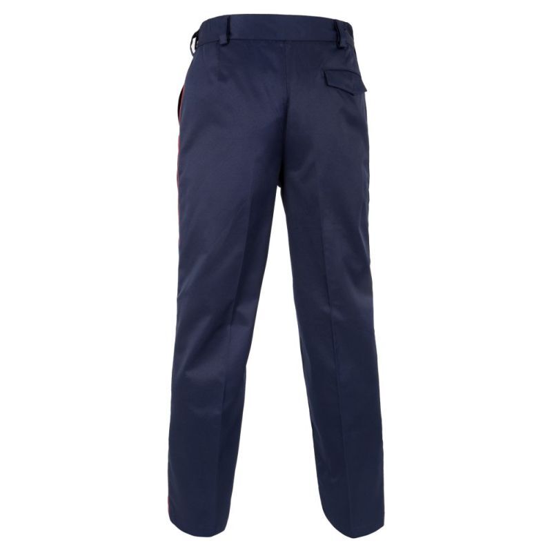 Брюки прямого силуэта без подкладки, гульфик на молнии. Два боковых кармана и красный кант на всей длине бокового шва.