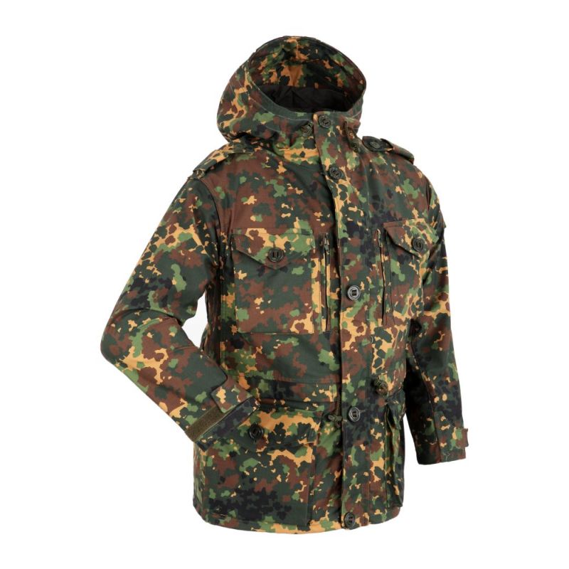 На куртке расположены восемь карманов – два нагрудных прорезных на молнии и два нагрудных накладных кармана с клапанами и застежкой на петли-пуговицы, два внизу куртки объемных накладных с клапанами, один на левом рукаве и один внутренний для документов. Внешняя регулировка объема куртки на уровне талии. Предусмотрены погоны со съемными шлевками. Регулировка манжеты рукава осуществляется с помощью паты с текстильной застежкой.