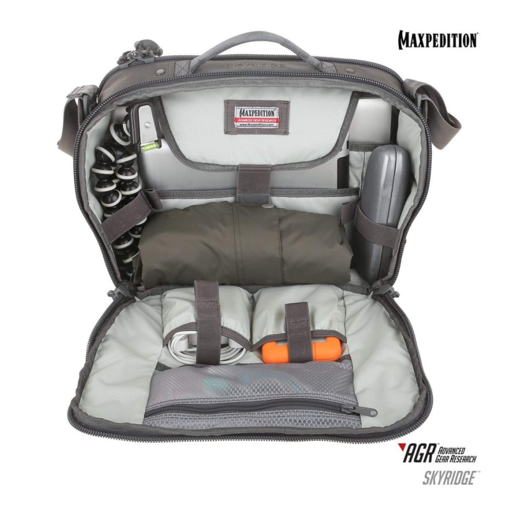 Maxpedition AGR Skyridge представляет собой удобную сумку для ношения через одно плечо. Переднее отделение с органайзером может закрываться как на магнит, так и на молнию. В главном отсеке имеются многочисленные карманы, отделения и эластичные крепления. Имеется также специальный отсек для ноутбука на 13,3 дюйма и мягкий карман для таблеток. Плечевой ремень включает в себя изогнутую плечевую подкладку и поворотные соединения.