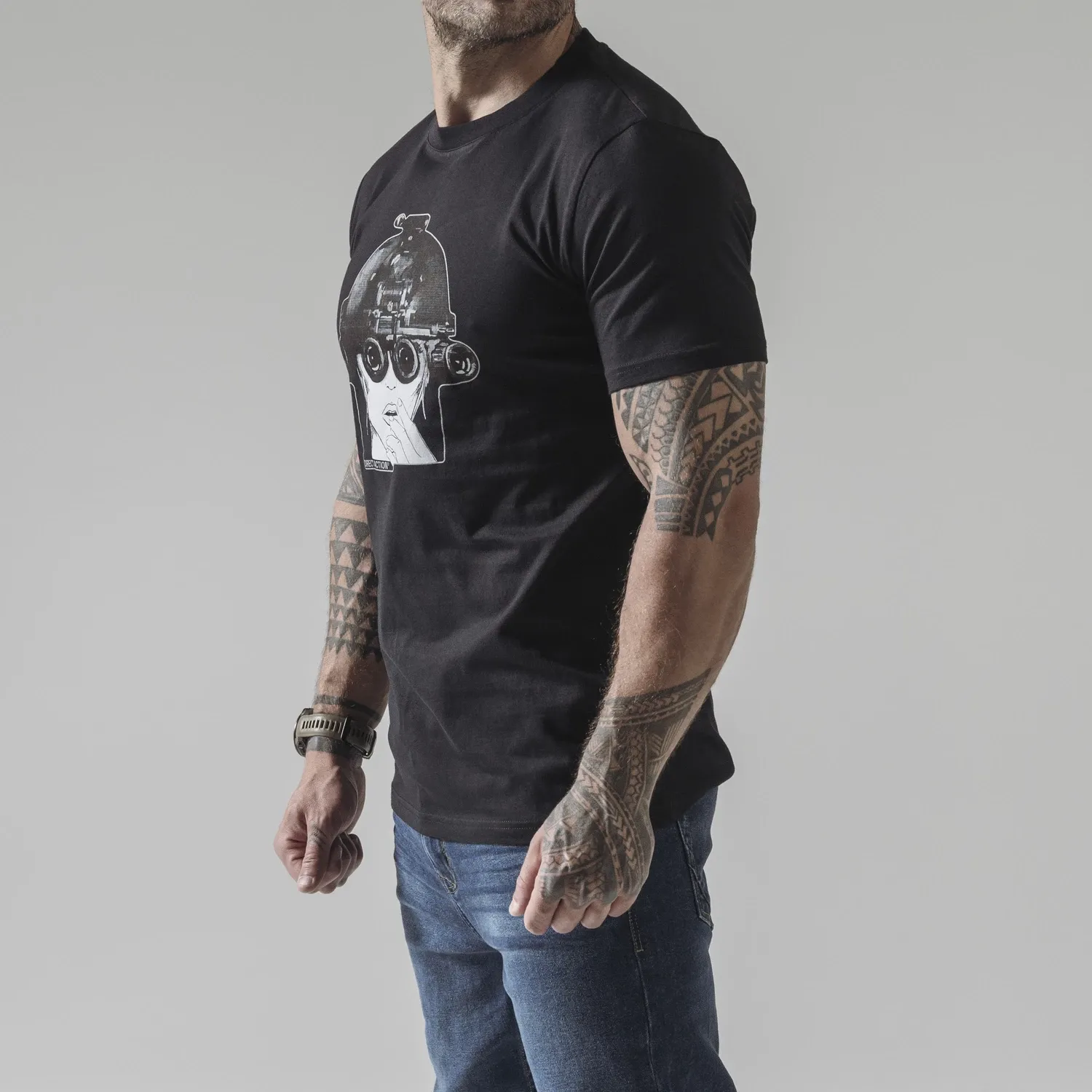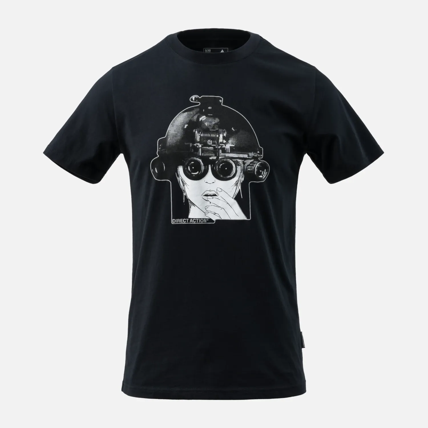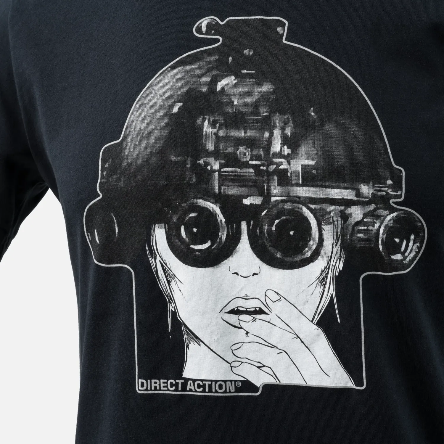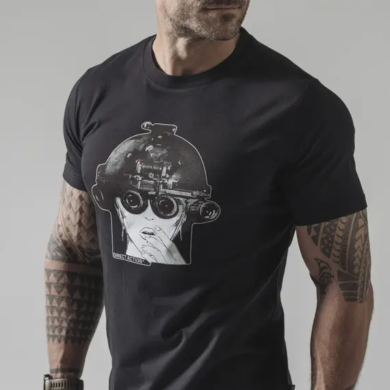 Футболка с изображением девушки в шлеме с очками ночного видения.