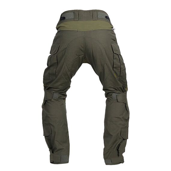 Тактические штаны имеют широкие шлёвки, усиление в области сидения, съёмные наколенники. Брючины заужены книзу. У штанов есть два передних кармана, два грузовых набедренных кармана сбоку, два задних кармана на молнии, два небольших грузовых кармана спереди на бедрах, два кармана сбоку в области голени.