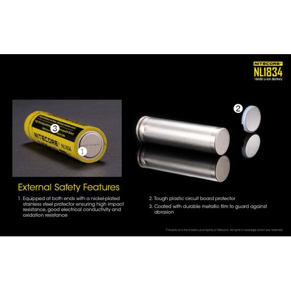 Емкий, надежный безопасный – все эти характеристики присущи аккумулятору Nitecore NL1834. Благодаря продуманности конструкции, применению высококачественных материалов и использованию новейших технологий, этот элемент питания обладает емкостью 3400 мАч и способен нормально работать даже после 500 циклов перезарядки. Ещё одним достоинством Nitecore NL1834 является наличие встроенной защиты, которая защищает аккумулятор от чрезмерного разряда или перезаряда. Данная защитная плата располагается за специальной пластиной, которая оберегает её от различных физических воздействий (падения, вибрация, удары и т.п.). Также к особенностям аккумулятора можно отнести наличие встроенного клапана для отвода газов, которые скапливаются в элементе питания при чрезмерном нагревании. Данный клапан срабатывает автоматически, и благодаря нему аккумулятор способен работать даже в самых экстремальных условиях. Особенности: литий-ионный аккумулятор 18650; выходное напряжение 3,7 В; емкость 3400 мАч; габариты – 18,3 х 69,2 мм; вес – 45,6 грамм; защитная плата от переразряда и перезаряда; более 500 полных циклов перезарядки; с двух сторон присутствуют никелированные пластины из нержавеющей стали, обеспечивающие хорошую ударопрочность; встроенный клапан сброса давления, который срабатывает при чрезмерном нагревании аккумулятора; выдерживает зарядку током до 2А включительно (рекомендованный ток зарядки – 1А).