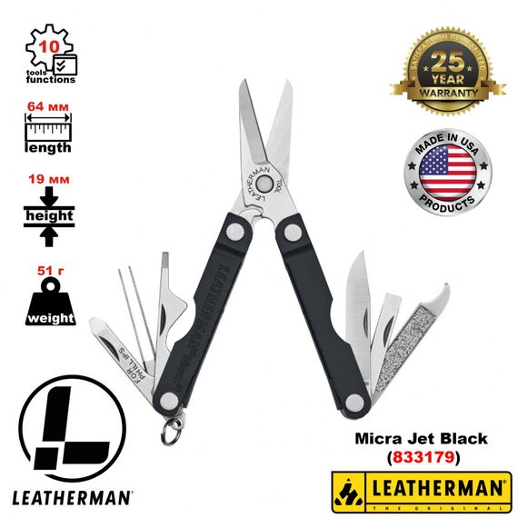 Компактный брелок-мультитул с ножницами LEATHERMAN Micra Jet Black 10 инстр. (Multi-Tool)