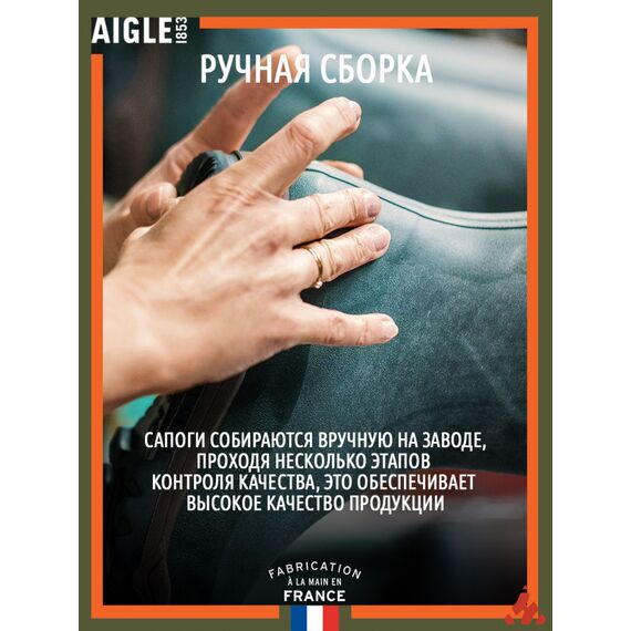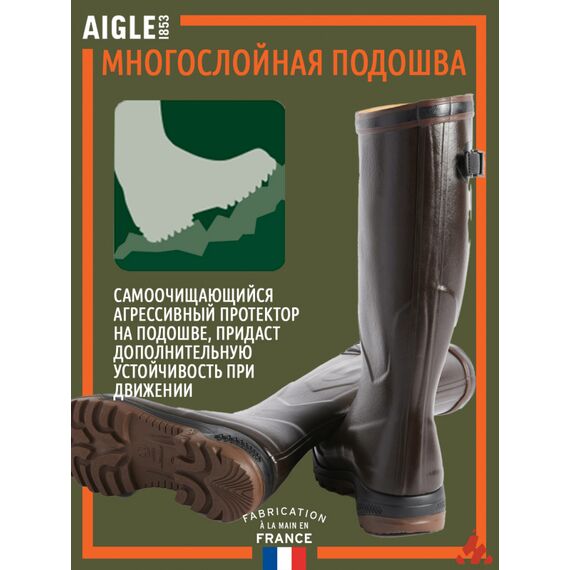Высокие сапоги (до колена) из натурального каучука. Специальная застёжка сбоку облегчает процесс снятия и надевания и позволяет регулировать ширину голенища (специальная непромокаемая вставка). Внутри подкладка (быстросохнущая) со специальной антибактериальной пропиткой против образования плесени, и неприятного запаха внутри сапога(который свойственен большинству аналогов). Подошва изготовлена из смеси каучука и полимера - это увеличивает эластичность и износостойкость. Конструкция сапога: Подошва состоит из трех частей: протекторной, амортизационной и дополнительный массажирующий амортизатор в пятке. Сверху сапога вставка в виде расширителя для заправки брюк и удобной регулировки размера икры. Расширитель сделан из дополнительного слоя каучука. От икры до подошвы идет 2 слоя каучука. Голеностоп сделан из 3 слоев каучука. Пятка и носок сделаны из 4 слоев каучука. Вдоль всей подошвы на высоту 1 см. усиление пятым слоем каучука. Сборочный шов сзади закрыт полосами из каучука в 2 слоя. Особенности сапог Aigle 2 поколения: - новый рисунок протектора подошвы обеспечивает еще большее сцепление - новый дизайн с отображением фирменных логотипов - уникальная запатентованная система амортизации в подошве, не имеющая аналогов в мире Технологии: Gomma Plus: результатом продолжительных обширных исследований и испытаний компании AIGLE стал материал Gomma Plus, который является смесью натурального каучука со специальными добавками, что позволяет интенсивно использовать сапоги из этого материала в течение долгого времени даже в условиях контакта с активными минеральными и химическими веществами (очень важно для использования в сельском хозяйстве). Устойчивость Gomma Plus к воздействию озона придаёт ему долговечность, в разы превосходящую другие аналоги, – резина теряет эластичность и стареет в геометрической прогрессии, а Gomma Plus служит долгие годы. Softex: пористый материал из полиамида обладает наилучшей способностью поглощать пот. Очень комфортно при использовании, но главное просто незаменимо в случае намокании внутренней части сапог (самое быстрое высыхание без ощущения сырости и холода). Sanitized: запатентованная фирмой AIGLE добавка для внутренних частей сапог. Она обладает антибактериальными и гигиеническими свойствами, которые защищают сапоги от образования плесени (все знают неприятный запах резиновых сапог) и делают непригодной среду для жизни микроорганизмов (ведь чего только не зачерпнешь вместе с водой). Уникальность добавки в том, что она не вымывается при многократном воздействии водой и моющими средствами. Actigrip: Подошва Actigrip создана фирмой AIGLE по уникальной технологии с учётом 150-летнего опыта производства сапог из каучука. Результатом столь долгих изысканий стала подошва, обладающая исключительной эластичностью (подошва-амортизатор), твердостью, устойчивостью, а главное она не скользит. Сегодня эта технология используется в линейке сапог Parcours, которая сочетает все различные комбинации последних новаций. Эти подошвы в соче...