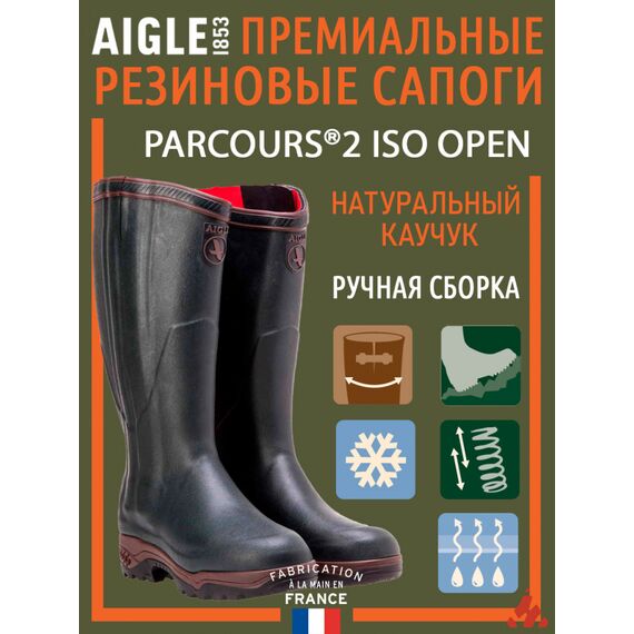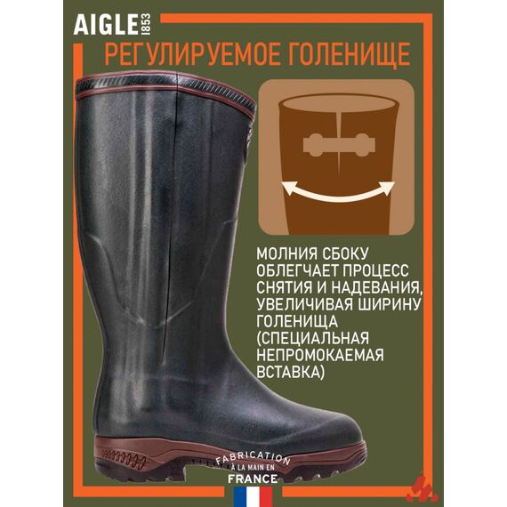 Высокие сапоги (до колена) из натурального каучука на молнии. Подкладка из неопрена (4,5 мм.) очень комфортна для носки, а главное превосходно сохраняет тепло. Молния сбоку облегчает процесс снятия и надевания, увеличивая ширину голенища (специальная непромокаемая вставка). Подошва изготовлена из смеси каучука и полимера - это увеличивает эластичность и износостойкость. Эти сапоги отлично подойдут для использования в любое время года, благодаря неопреновому утеплению. Технологии: Gomma Plus: результатом продолжительных обширных исследований и испытаний компании AIGLE стал материал Gomma Plus, который является смесью натурального каучука со специальными добавками, что позволяет интенсивно использовать сапоги из этого материала в течение долгого времени даже в условиях контакта с активными минеральными и химическими веществами (очень важно для использования в сельском хозяйстве). Устойчивость Gomma Plus к воздействию озона придаёт ему долговечность, в разы превосходящую другие аналоги, – резина теряет эластичность и стареет в геометрической прогрессии, а Gomma Plus служит долгие годы. Neoprene: материал создавали для гидрокостюмов, используемых зимой в холодной воде, но теперь он нашел много сфер для применения. Неопрен обладает микропористой структурой, что обеспечивает самую лучшую теплоизоляцию среди всех аналогов. Состоит материал из двух слоёв: большую объёмную часть занимает полихлоропрен (микропоры), а уже с внешней и внутренней стороны он запечатан плотным полиамидом – эффект термоса. Actigrip: Подошва Actigrip создана фирмой AIGLE по уникальной технологии с учётом 150-летнего опыта производства сапог из каучука. Результатом столь долгих изысканий стала подошва, обладающая исключительной эластичностью (подошва-амортизатор), твердостью, устойчивостью, а главное она не скользит. Сегодня эта технология используется в линейке сапог Parcours, которая сочетает все различные комбинации последних новаций. Эти подошвы в сочетании с разным протектором (как правило, сама очищающимся при ходьбе) обеспечивают уверенность в движении даже на скользких камнях покрытых илом. Характеристики сапог AIGLE Parcours 2 Generation Iso Open: вес - 2,58 кг. (размер 41); Габариты: h=40,5 см., a=23-30 см., e=20-22 см., с=21 см. (размер 41).