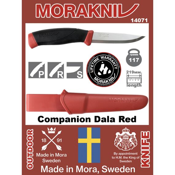 Этот нож является новым исполнением уже так полюбившегося всем ножа "Mora Clipper 860 MG". Отличается он от своего предшественника увеличенной толщиной клинка, более острым углом заточки, на ручке теперь появился фирменный логотип "MORAKNIV". Универсальный нож для использования в любой сфере деятельности(охота, рыбалка, строительство, туризм). Нож имеет удобную и не скользящую в руках рукоять. Лезвие изготовлено из холодно-катаной нержавеющей стали "Sandvik". "Sandvik" - шведская сталь марки "12C27" содержит 0,6% углерода и 13,5% хрома. Уникальная твердость 52-60 HRC по Роквеллу достигается закалкой жидким азотом при температуре -80°C. Для предотвращения коррозии, ржавчины в сталь добавлен хром 13-18%, а для дополнительной твердости еще добавляют углерод 0,4-0,7%. Ножны, входящие в комплект, отлично выполняют 2 свои главные функции: удобное ношение и предохранение от травм, повреждений клинка. Кто-то скажет - что его нож никогда не наносил ему вреда - на это ответ очень простой – зачем вообще таскать с собой нож настолько тупой, что он не представляет опасности в обнаженном виде. Специальный фиксатор внутри ножен не даст возможности грохотать клинку в ненужный момент и не позволит покинуть ножны клинку без Вашего желания и участия, поэтому Вы не столкнетесь с проблемой «вот оно было - и нет», даже если будете продираться через чащобу, «плыть» в глубоком снегу или свалитесь в воду. Чтобы освободить нож достаточно его немного потянуть до характерного щечка, который скорее не слышен уху, а ощутим руке. Компания "Mora" проанализировала историю ношения ножей и пришла к выводу самым разумным является размещение ножа на ремне(на поясе). Если бы было иначе, то размещение на ремне не было бы самым распространенным Ушко для крепления на ремень позволит надежно закрепить клинок, а главное избавит Вас от необходимости расстегивать и снимать ремень, чтобы освободить нож(каждый знает как приятно возиться под курткой в мороз с ремнями, шнурками и застежками). Современный термопластик ножен устойчив к низким температурам, соленой воде и долгому воздействию воды (что не скажешь о кожаных ножнах, которые надо сушить). Дизайн выполнен с учетом необходимой очистки и промывки ножен после загрязнения(отверстие снизу для удаления воды, гладкая поверхность). Характеристики ножа Mora Companion MG: длина клинка - 103 мм; ширина клинка - 21 мм (max); толщина клинка - 2,5 мм (для нержавейки); 2 мм (углеродистая); длина ножа - 219 мм; сталь - нержавеющая Sandvik (54-56HRC) или углеродистая (56-58HRC); рукоять - прорезиненный пластик; ножны - пластик; размеры в собранном виде - 21,8х3,8 см; вес - 116 г (110 г версия Carbon). Нож Mora Companion MG купить в Москве с доставкой по России лучше всего у нас - прямого импортера в Россию от производителя Mora (подтверждается наличием сертификата). Вы будете защищены от рисков покупки подделки, контрабандного товара или некачественного товара с браком.
