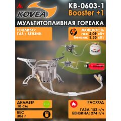 Мульти-топливная газовая горелка KOVEA Booster 1 KB-0603-1 сочетает в себе лучшее из вариантов газовых и бензиновых горелок - универсальная и простая в использовании позволяет использовать в качестве топлива газ или бензин, без дополнительных замен форсунки. Ножки и опоры для нагреваемых сосудов...