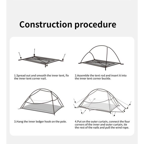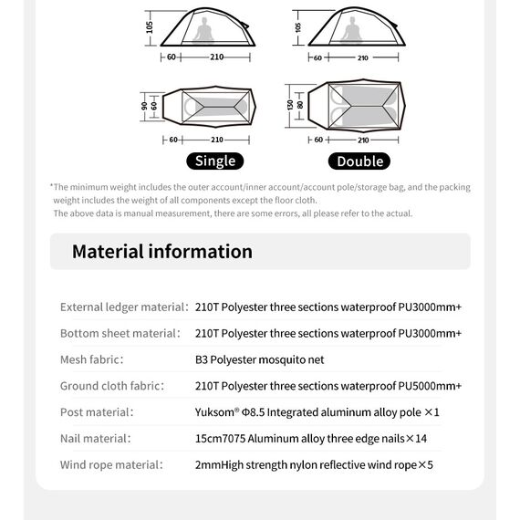 Легкая двухместная палатка Naturehike Cloud UP 2 BASE. Для пеших, водных и вело-походов. Легкий вес, компактность в сложенном виде и просторность в разложенном - отличный выбор для похода и отдыха на природе. Внешний тент выполнен из полиэстера 210T с плетением RipStop и PU покрытием. Водонепроницаемость 3000 мм водяного столба позволяет выдержать дождь любой интенсивности и продолжительности. В просторный тамбур можно разместить пару рюкзаков. Внутренняя палатка надежно защищает от сквозняка, нижняя часть по всему периметру изготовлена из дышащей ткани. Верхняя часть для сохранения хорошей вентиляции выполнена из микросетки, надежно защищающей от насекомых. На потолке внутри имеется крючок для подвески фонарика. На стенках удобные кармашки из сетки для различных мелочей, которые будут всегда под рукой. Внешний тент крепится и натягивается с помощью надежных фирменных фастексов. Все швы тента и дна качественно проклеены специальной лентой, препятствуют проникновению влаги через нитки. Пол в виде ванны, бортики которой защищают от брызг жилое пространство даже в косой дождь при ветре. Каркас изготовлен из очень прочного, но гибкого легированного алюминия марки 7001. Основное достоинство этого сплава в том, что он практически не подвержен остаточной деформации. Это значит, что после сборки палатки все элементы снова приобретают первоначальную прямую форму. Дуги и колышки покрыты электрохимическим анодированием, что не только уберегает их от коррозии, но и придает нарядный вид. В комплект входит дополнительный пол (футпринт), защищающий дно палатки от повреждений острыми ветками или камнями. Вес футпринта в чехле 240 г, водостойкость 5000 мм. Полный вес палатки не включает в себя вес футпринта. Количество мест: 2 Водостойкость тента, мм: 3000 Водостойкость дна, мм: 5000 Размер спального места: 210x130x105 Материал тента и дна: Полиэстер 210T Материал внутренней палатки: Полиэстер 210Т, противомоскитная сетка B3 Материал каркаса: Алюминиевый сплав Внешний размер, см: 270x130x105 Размер в сложенном виде, см: 40х13х13 Вес, кг: 1 Количество входов: 1 Количество слоев: 2