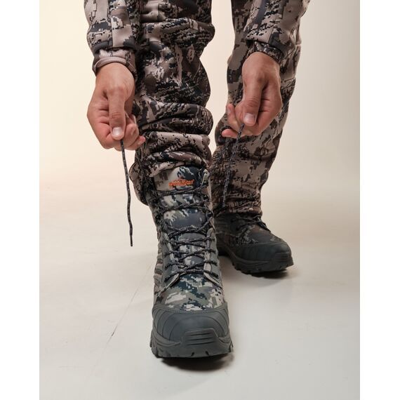 Модель плотно фиксируется на ноге при помощи усиленной шнуровки. Камуфлированный окрас Figure хорошо сочетается с зимней экипировкой, создавая единый силуэт охотника в заснеженной или лесистой местности.