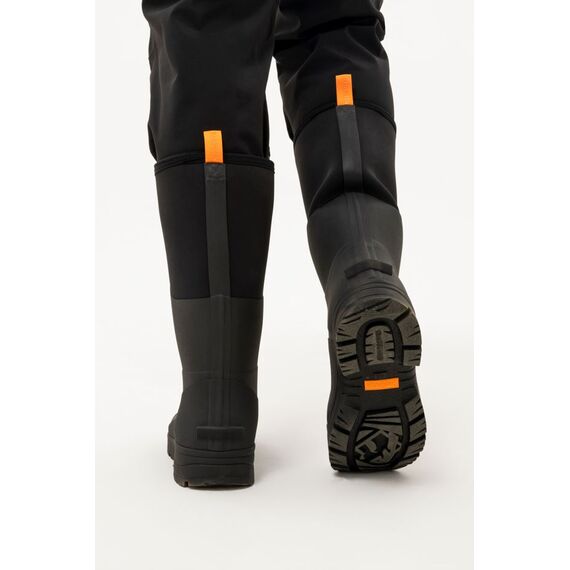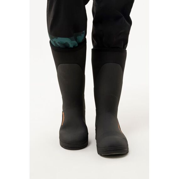 Верх и подошва выполнены из прочной резины, что обеспечивает высокую герметичность. Благодаря вставкам из эластичного неопрена сапоги удобно садятся по ноге, а специальная петля на заднике облегчает процесс надевания.