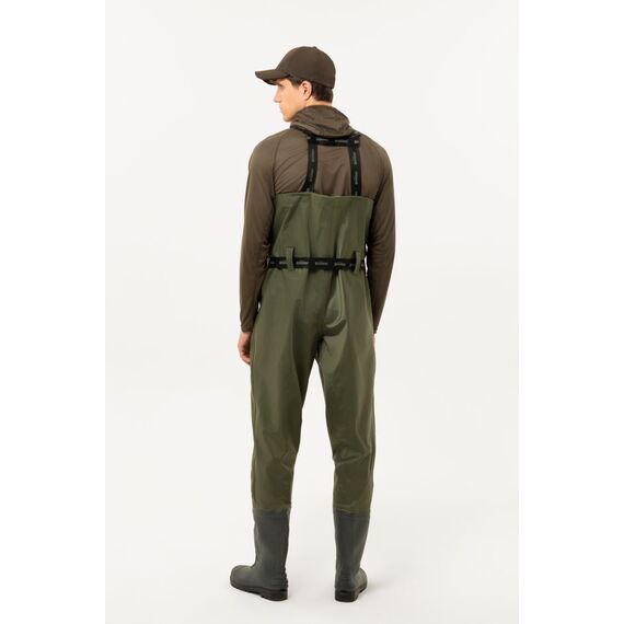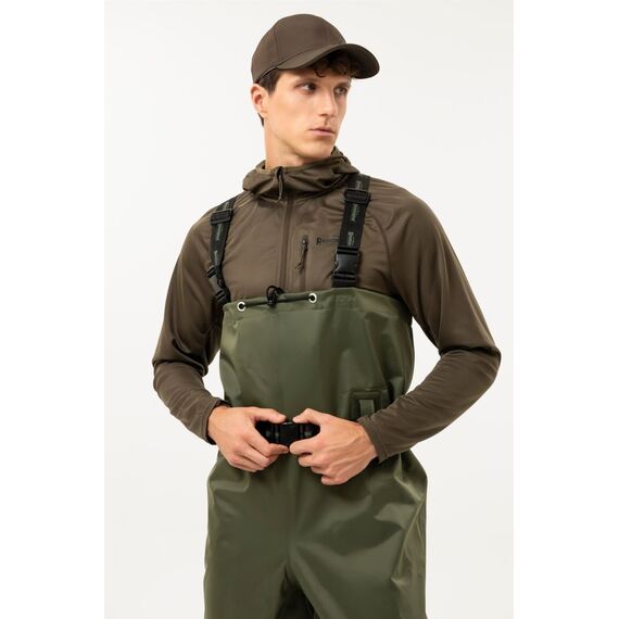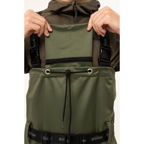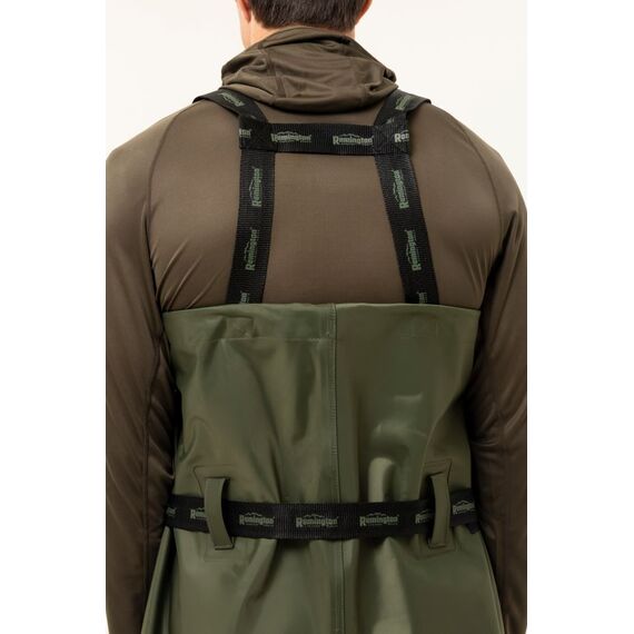 Remington Olive Wading Boots — рыбацкий полукомбинезон, незаменимый на воде как в летнее время, так и при понижении температуры до 0 °C. Изготовлен из водоотталкивающего материала ПВХ "Винитол", сапоги герметично соединены с верхом, что обеспечивает полную водонепроницаемость. Комбинезон хорошо сохраняет тепло, отличается лёгкостью и удобством, а регулируемые плечевые лямки обеспечивают комфортную посадку и свободу движений при активной рыбалке.