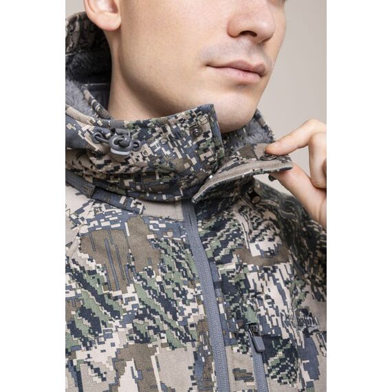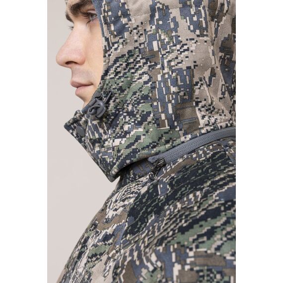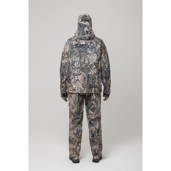 Ткань костюма обработана DWR пропиткой для защиты от осадков. Куртка оснащена съемным капюшоном с регулировкой по объему, искусственным мехом внутри и ветрозащитной планкой на молнии, которая препятствует попаданию холодного воздуха. Для регулировки объема на рукавах предусмотрена молния.