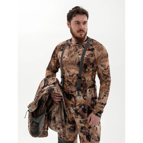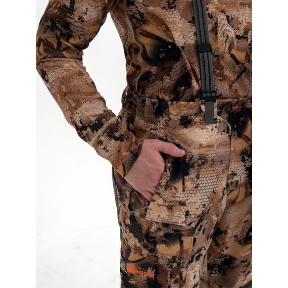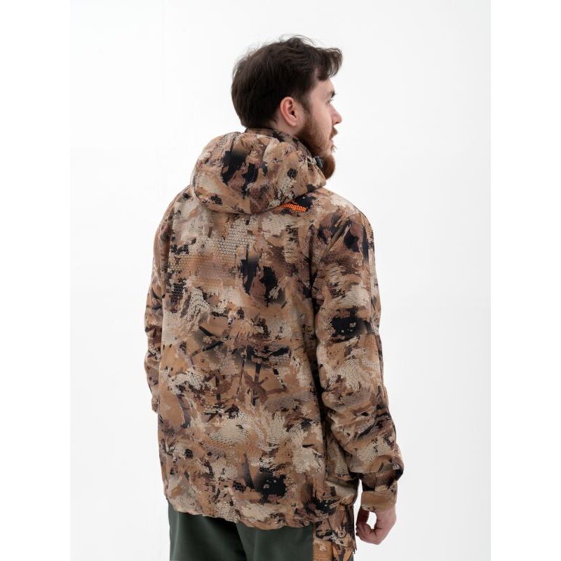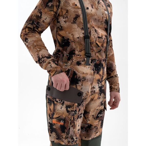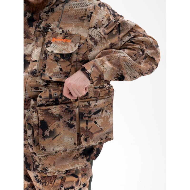 Костюм Remington Mont Blanc Yellow Waterfowl Honeycombs разработан специально для охоты на водоплавающую дичь в условиях переменчивой демисезонной погоды. Модель включает куртку с потайным капюшоном и брюки на подтяжках. Основа комплекта — мембрана Climatic Extreme, обеспечивающая паропроницаемость 10 000 г/м²/24 ч и водонепроницаемость 12 000 мм. Эти характеристики позволяют сохранять тело сухим при высокой активности и эффективно защищают от дождя и ветра. Конструкция учитывает анатомию движения: локти и колени усилены, крой обеспечивает свободу при интенсивной эксплуатации.