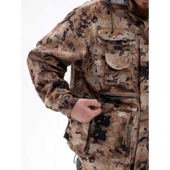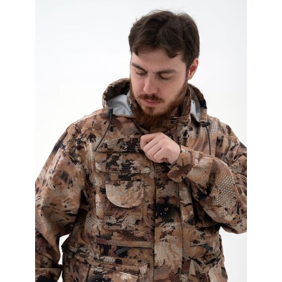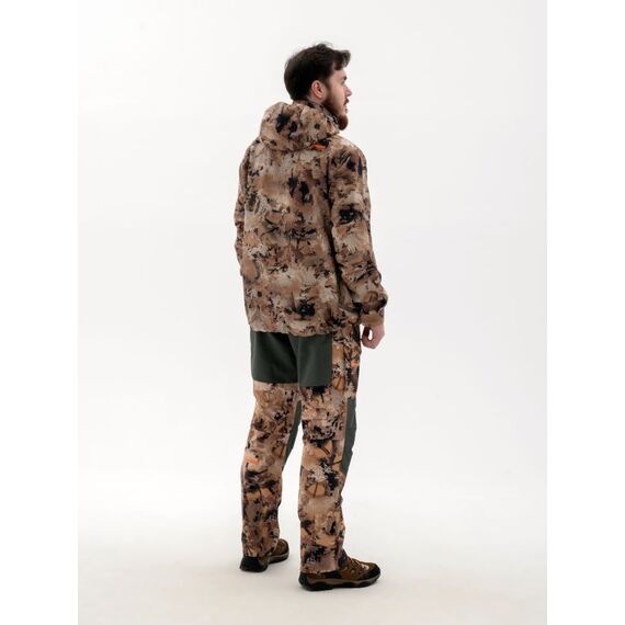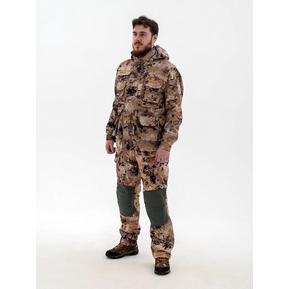 Куртка оснащена двухзамковой молнией с внешней и внутренней ветрозащитными планками, что позволяет расстегивать её сверху или снизу, облегчая доступ к пододетой экипировке. Капюшон регулируется кулисой, как и низ изделия, а объём рукавов настраивается кнопками. Брюки дополнены семью вместительными карманами, усилены на коленях и в области седалища, что увеличивает износостойкость при контакте с влажными поверхностями. Всего костюм насчитывает 22 кармана, включая 15 на куртке, что делает его крайне удобным при продолжительных выходах на природу.