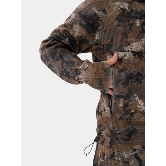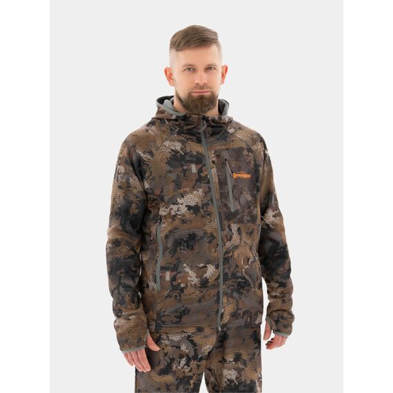Флисовая подкладка на спине и в капюшоне сохраняет тепло. Карманы в боковых швах на куртке и брюках позволяют разместить необходимые вещи. Эластичный пояс и утягивающий шнурок обеспечивают хорошую посадку. Манжета по низу брюк защищает от пыли и ветра. Модель разработана совместно с охотниками для максимальной функциональности в полевых условиях.