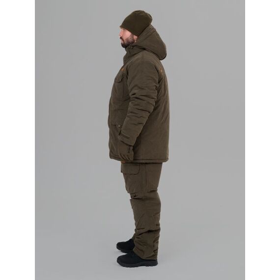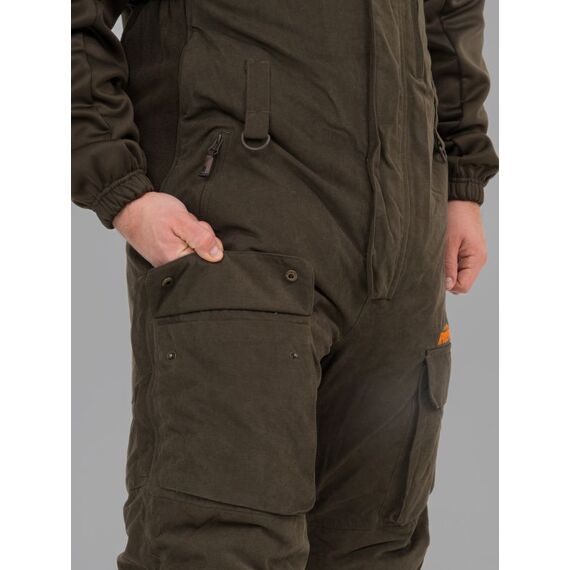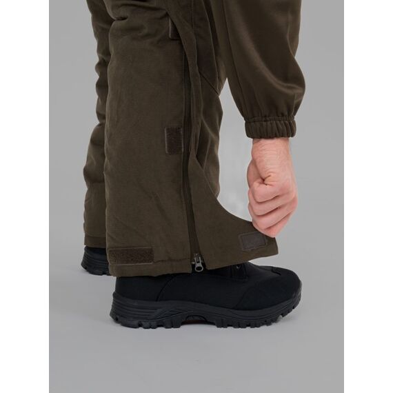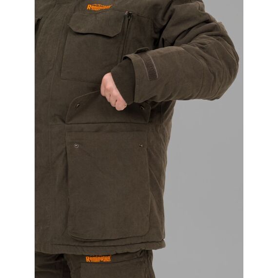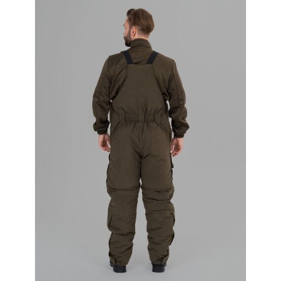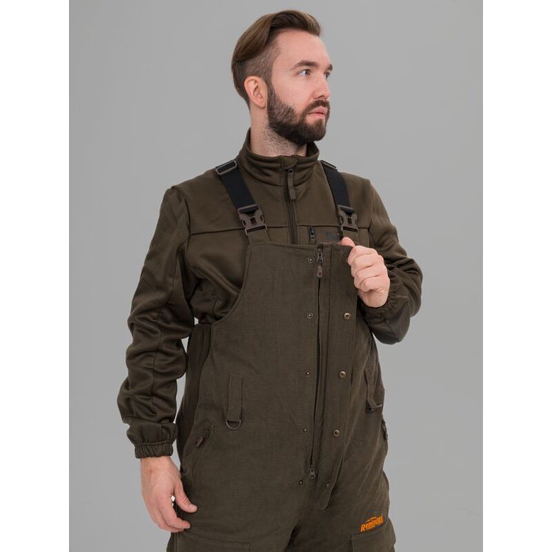 Костюм зимний Remington Snag Dark Olive выполнен снаружи из ворсистого полиэстера, который обеспечивает бесшумность при движении. Костюм имеет свободный крой и множество регулировок. На высоком полукомбинезоне по бокам предусмотрены эластичные вставки и регулируемые подтяжки, что обеспечивает хорошую посадку на любой фигуре.