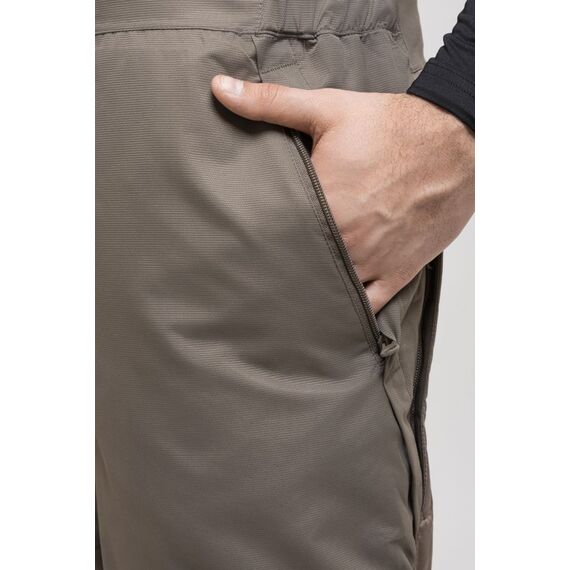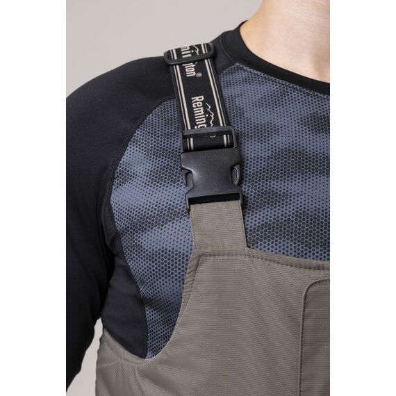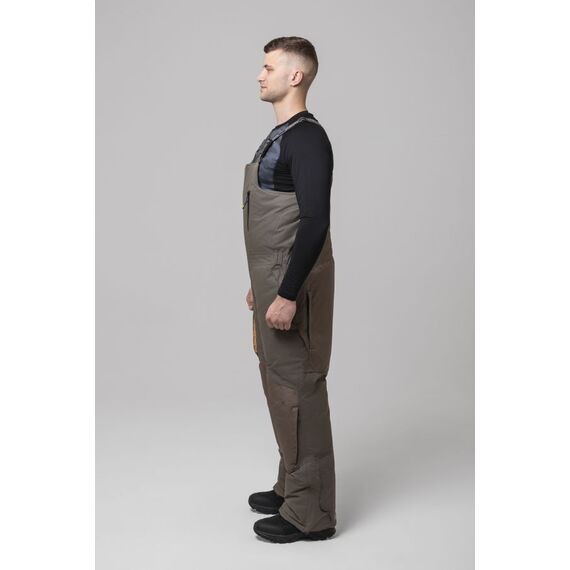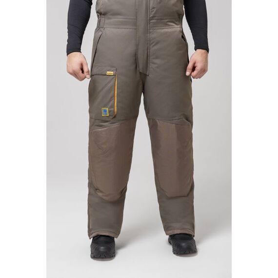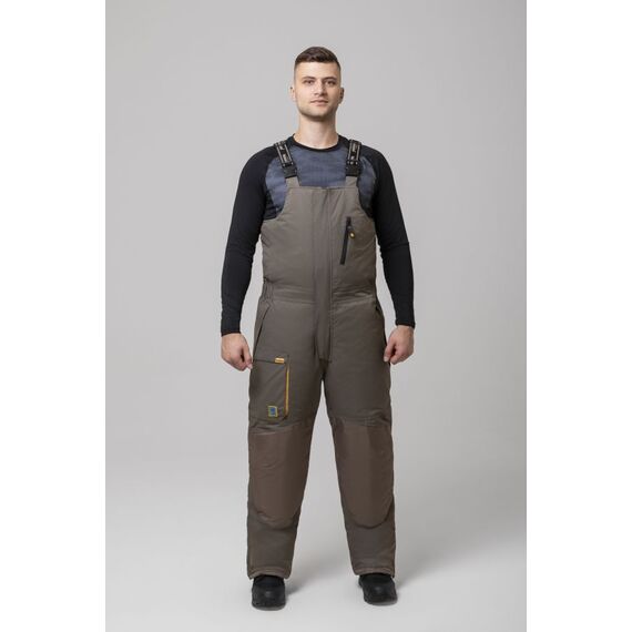 Полукомбинезон с эластичными бретелями и широким поясом плотно прилегает к телу, предотвращая попадание холода. Усиленные вставки на задней части и в области колен повышают износостойкость.